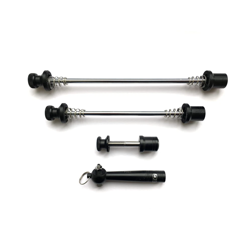 Een ingenieuze set snelspan-assen tegen dieven met lange vingers, bestaande uit een voor- en achteras, alsmede een zadelpenkoordspanner. De diefstalveilige quick-release assen kunnen alleen worden geopend met de speciale quick-release hendel (bij de levering inbegrepen).